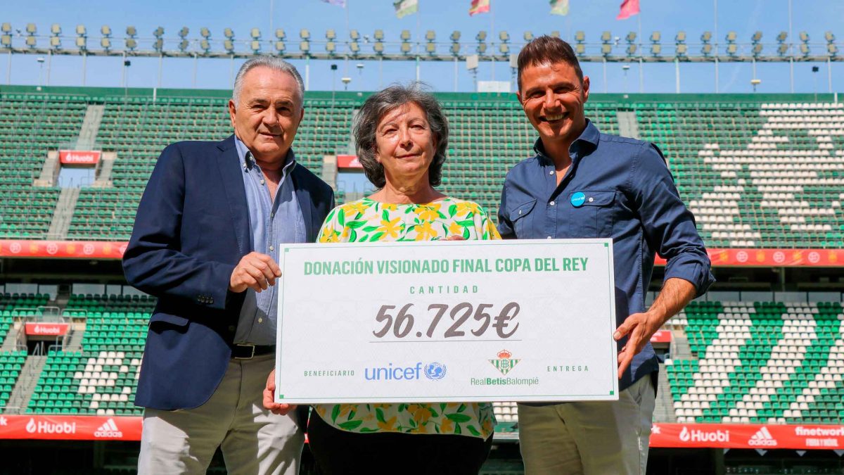 En concreto, el club verdiblanco ha donado a UNICEF 56.725 euros, cifra resultante de la venta íntegra de entradas para ver la final de la Copa del Rey en el Estadio Benito Villamarín. Una cita a la que asistieron miles de béticos que pudieron disfrutar de este momento histórico y a la vez, colaboraron con esta causa solidaria.