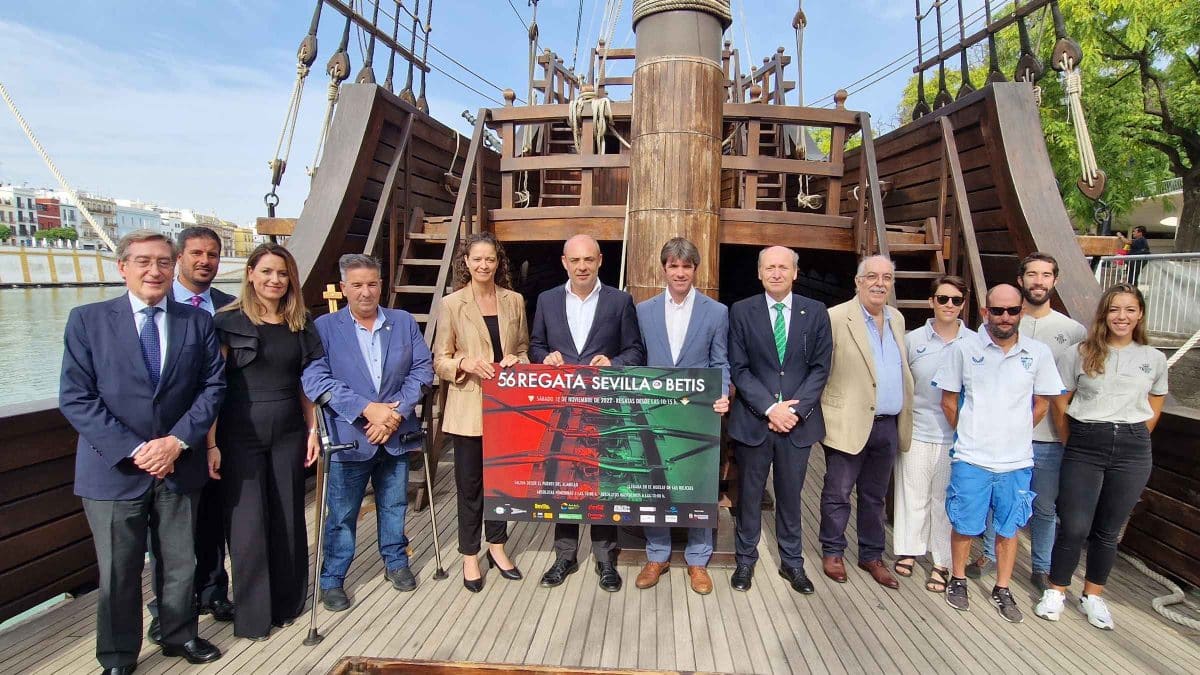 La 56ª Regata Sevilla-Betis ha presentado el cartel que ilustra la clásica cita el sábado 12 de noviembre. La imagen oficial del derbi del Guadalquivir, que se disputa desde 1960 en la modalidad de ocho con timonel con botes representativos de Sevilla F.C. y Real Betis Balompié, se ha dado a conocer en un acto que ha tenido como escenario la icónica Nao Victoria, cedida para la ocasión por la fundación homónima y cuya réplica está expuesta en los bajos del Paseo Marqués de Contadero frente al Espacio Primera vuelta al mundo. Además del cartel, obra de Curro Casillas, se han dado a conocer las principales novedades de una clásica del remo hispalense que ha concitado en su primera comparecencia oficial.