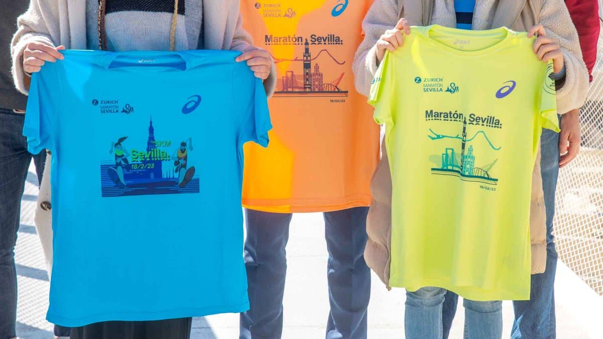 El Zurich Maratón de Sevilla 2023 ha presentado las camisetas oficiales de la prueba del próximo 19 de febrero, que en esta ocasión han sido diseñadas por alumnos de la Facultad de Bellas Artes de Sevilla. El diseño representa un perfil del skyline de la ciudad presidido por una reproducción artística de la Giralda y la Torre del Oro acompañadas por puentes de la ciudad, desde el V Centenario pasando por Barqueta hasta el Alamillo, sobre la lámina azul del río Guadalquivir.