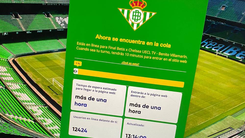 Desde que se ha abierto la opción de comprar las entradas para ver la final de la Conference League en el Villamarín a través de la pantalla gigante (de 360º) que se situará el 28 de mayo en el centro del estadio, los problemas, en forma de cola de espera, no han cesado. El encuentro, que enfrentará al Real Betis y al Chelsea, y que tendrá lugar en Breslavia, podrá verse en el estadio verdiblanco, en comunión futbolera, una opción fabulosa para aquellos que por diversas razones no podrán acudir a Polonia.