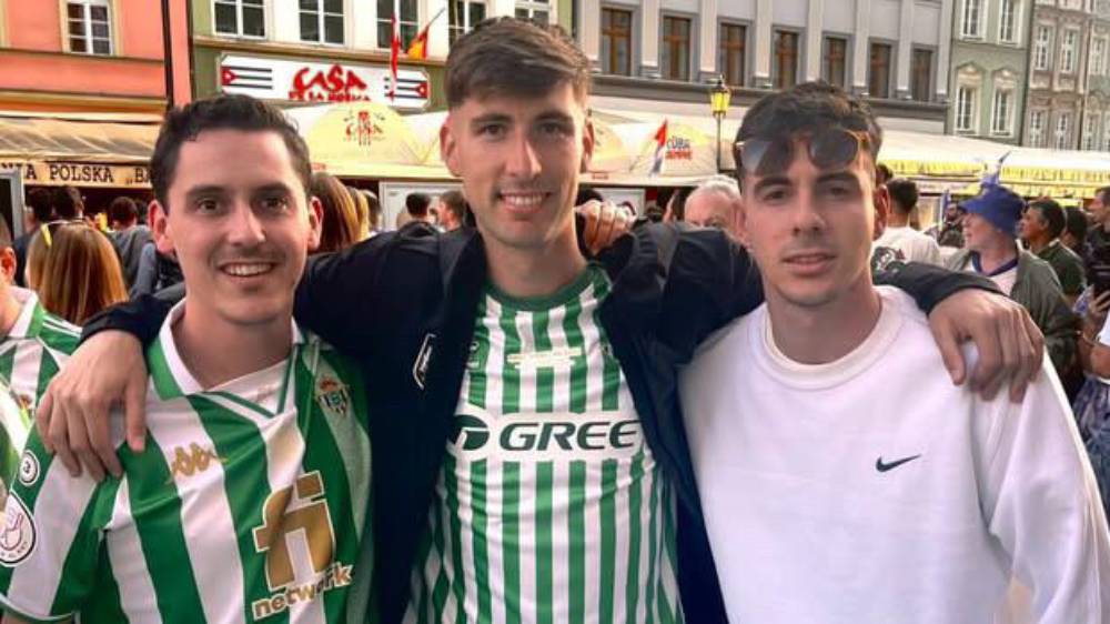 Juan Miranda, uno más en la fiesta del Real Betis por las calles de Breslavia el día de antes de la final de la Conference League. Ya quedan menos de 12 horas para que comience el histórico encuentro europeo en la ciudad polaca contra el Chelsea. En plena calle, entre bufandas verdiblancas, cánticos y nervios por la gran cita europea, un grupo de aficionados béticos no podía creer lo que veían en Breslavia. Mientras caminaban, se encontraron con Juan Miranda, el héroe de la final de Copa del Rey de 2022.
