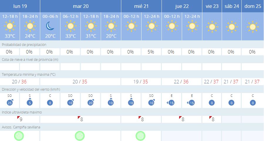 Las máximas fluctuarán hasta el jueves entre los 36 y los 37 grados, esperando al fin de semana para subir a los 37. Por su parte, las mínimas seguirán como en semanas anteriores, entre los 19 de este miércoles y los 22 del día siguiente.