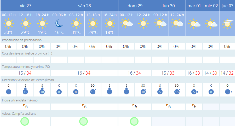 El sol dará paso a octubre en Sevilla con un fin de semana sin nubosidad. Las temperaturas se mantendrán estables con los siguientes valores: