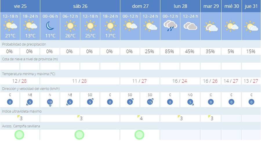 El viernes y el domingo serán los que incorporen nubosidad al panorama meteorológico sevillano, ya que el sábado los cielos estarán completamente despejados. En cuanto a las temperaturas, las máximas mayores serán las de viernes y sábado, con 28 grados, bajando a 27 el domingo.