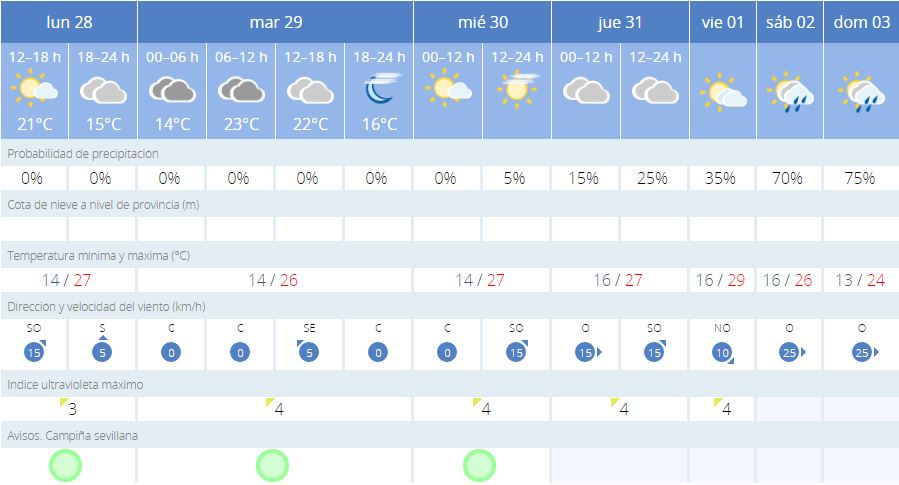 El tiempo en Sevilla sigue lejos de ser lo que generalmente se identifica como otoñal. Rozando los 30 grados de máximas, durante la semana que comienza sí se esperan que el sol dé paso algunos días a nubes de tormenta. Esta es la previsión.