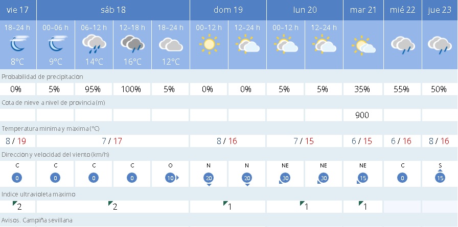 Las lluvias llegarán a la capital hispalense este sábado. Pese a que las temperaturas se mantendrán durante todo el fin de semana, aparecerán precipitaciones durante la mañana y tarde del sábado.