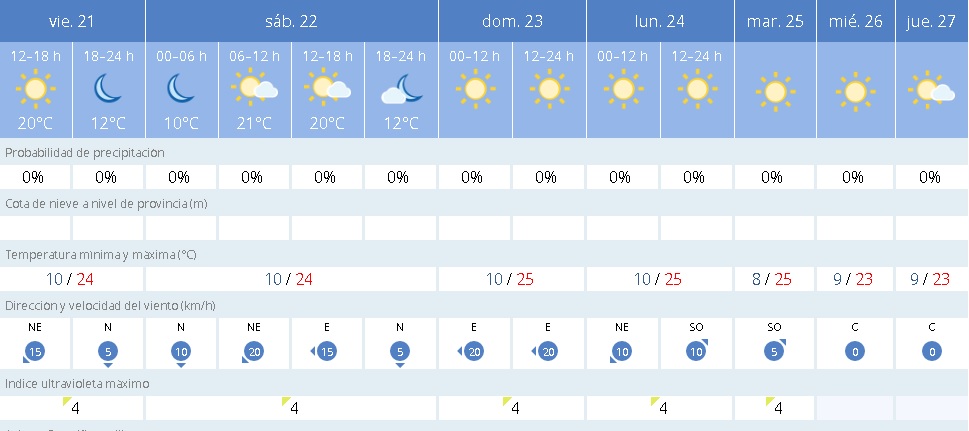 Las mínimas se mantendrán durante todo el fin de semana en los 10 grados, mientras que las máximas llegarán incluso hasta los 25 el domingo. Según la previsión de la Agencia Estatal de Meteorología (Aemet), los cielos, igualmente, se mantendrán principalmente despejados durante el domingo y el sábado. Así, esta tónica meteorológica se prolongará al menos hasta el próximo jueves.