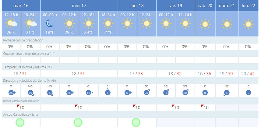 Las temperaturas irán ascendiendo paulatinamente a medida que vaya avanzando la semana. El domingo, día en el que entra oficialmente el verano, las temperaturas alcanzarán los 40ºC. Por otro lado, las temperaturas mínimas también subirán ligeramente, manteniéndose en torno a los 19ºC-20ºC durante toda la semana.