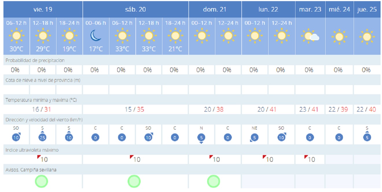El viernes será más agradable, con una máxima de 31 grados y una mínima de 17. Sin embargo, a partir del sábado, los termómetros irán subiendo y en apenas 48 horas, la capital hispalense alcanzará los 40 grados de máxima. Las mínimas también subirán.