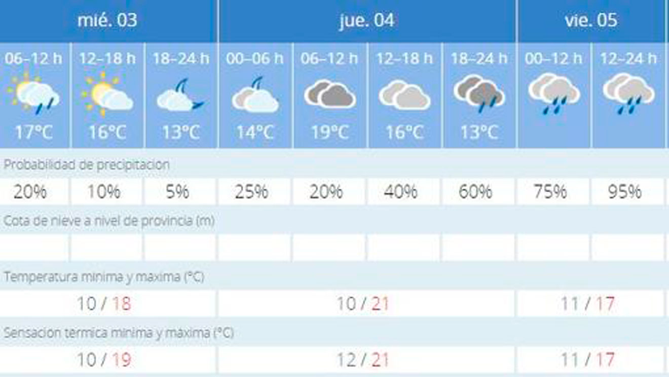 A partir de la noche del sábado al domingo, las precipitaciones irán decayendo, donde habrá un sol previsiblemente toda la mañana. Será a partir de la tarde del domingo donde vuelven las lluvias. Las temperaturas este día también caerán, con unas mínimas de 7 grados y unas máximas de 16 grados. Durante el lunes las lluvias se mantendrán, pero saldrá tímidamente el sol.