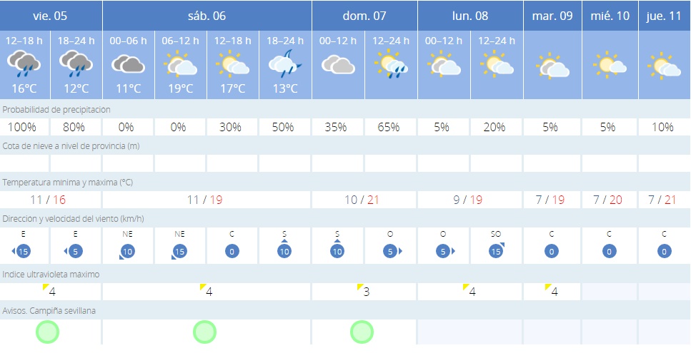 Estas temperaturas oscilarán entre los 10 grados centígrados y los 21 grados, con cielos que estarán cubiertos prácticamente todo el fin de semana. El riesgo de precipitaciones será de un 50% este sábado, y de un 65% el domingo.
