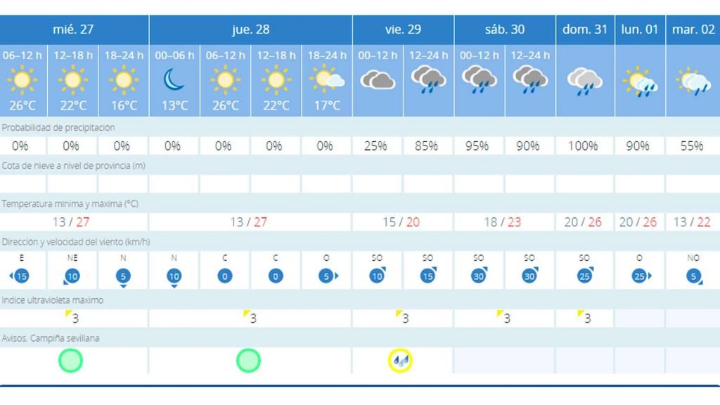 Estas oscilarán entre los 20 y los 27 durante la semana, siendo este miércoles y el próximo jueves los días más calurosos. Además, hasta el viernes, día en el que aparecerá la lluvia en Sevilla, se esperan cielos completamente despejados.