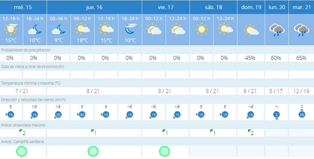 Las lluvias volverán a Sevilla tras el fin de semana, acompañadas de un leve descenso de las temperaturas máximas, aumentando las mínimas. Desde el próximo lunes, los cielos se volverán a cubrir, trayendo consigo precipitaciones con un 60% de probabilidad en la capital hispalense.