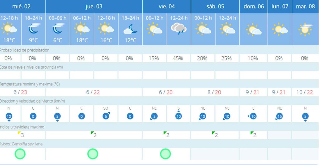 Los cielos se mantendrán despejados, con la presencia de alguna nube hasta el viernes, cuando la Agencia Estatal de Meteorología pronostica un 45% de probabilidades de lluvia entre las 12 del medio día y las 00:00 horas.