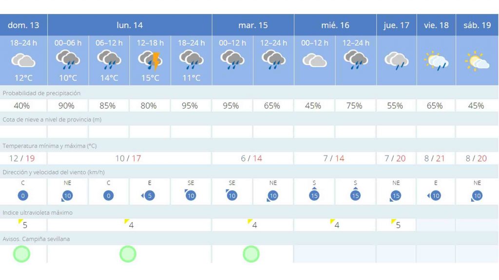 La lluvia se hace de rogar en Sevilla y, después de una previsión más que tormentosa para el fin de semana, la Agencia Estatal de Meteorología (AEMET) prevé un lunes con tormenta y una semana, en general, cargada de agua.