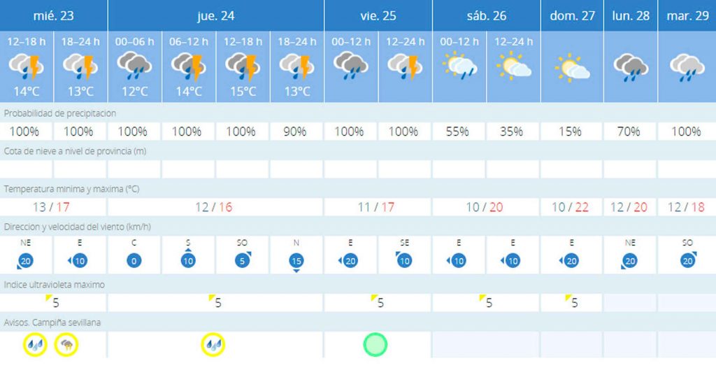 La AEMET pronostica un sábado con un 55% de probabilidades de precipitaciones hasta las 12 horas del medio día. A partir de dicha hora, las probabilidades se reducirán hasta el 35%, con cielos nubosos pero que dejarán ver el sol. Las temperaturas oscilaran entre los 10 grados centígrados de mínima y los 20 de máxima.