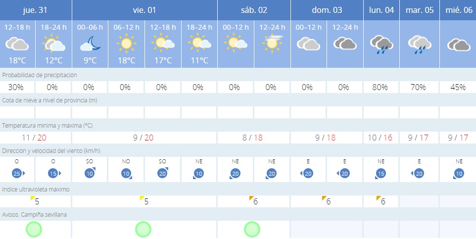 Tras las precipitaciones durante la mañana del jueves, Sevilla ya no espera más lluvia hasta el inicio de la próxima semana. Eso sí, se espera que las temperaturas máximas desciendan ligeramente a partir del sábado.