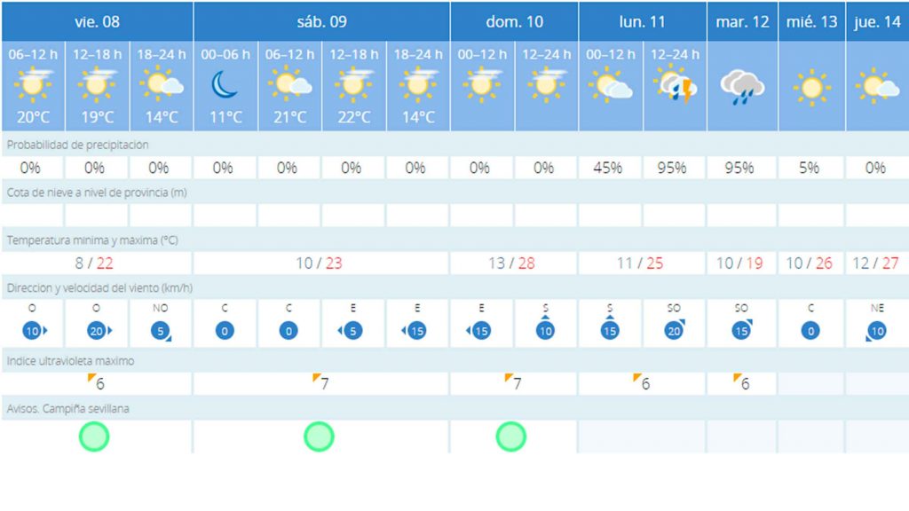 Desde este Viernes de Dolores hasta el Domingo de Ramos se espera un fin de semana con cielos despejados y sin probabilidad de precipitación. De esta manera, las hermandades de vísperas no corren riesgo alguno y se esperan mínimas de 8ºC y máximas de 28ºC.