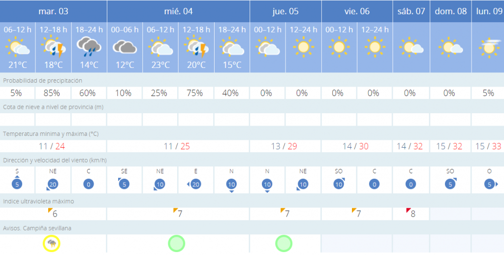 La previsión meteorológica de la semana publicada por la Aemet también muestra que el miércoles de Feria en Sevilla también se espera lluvia, especialmente entre las 12:00 y las 18:00 horas. En esa franja horaria, la probabilidad de lluvia en la provincia de Sevilla es del 75%, mientras que en las horas anteriores a esta franja es de 25% y después de 40%.