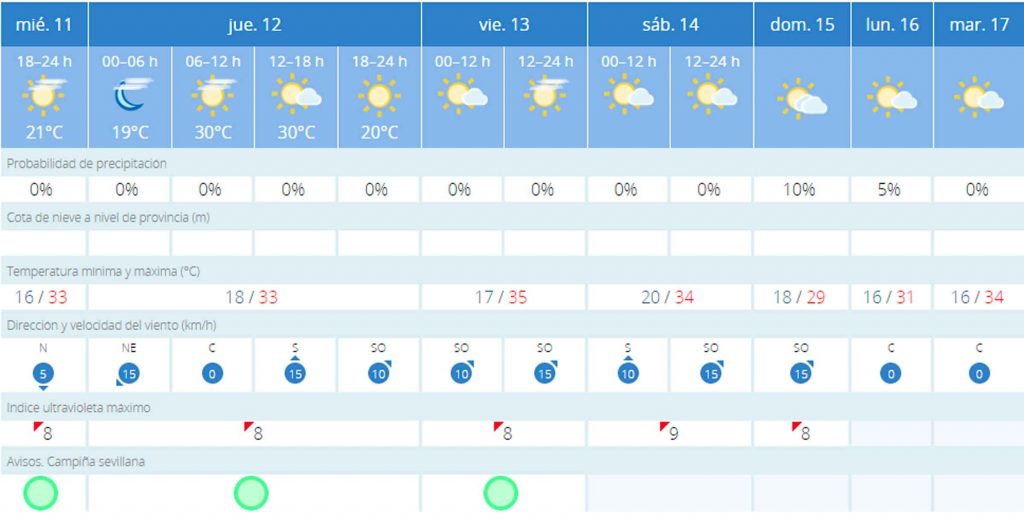 Para el sábado 14 de mayo nos espera más de lo mismo pero con una subida de las temperaturas mínimas. Las mínimas subirán hasta los 20 grados centígrados y las máximas bajarán un grado, quedándose en 34 grados centígrados. De nuevo, las probabilidades de precipitaciones será nulas.
