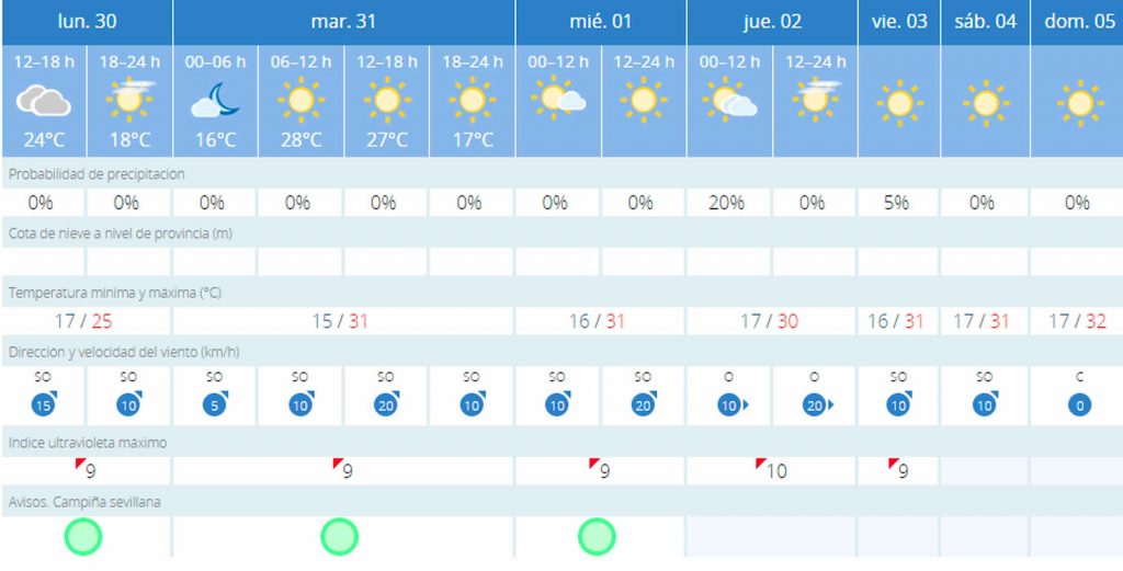 El calor sofocante volverá a dar un respiro a Sevilla esta semana, con temperaturas máximas que se mantendrán en torno a los 30 grados. Tras dos jornadas en las que la brisa fresca ha aliviado el calor de la primavera sevillana, este martes volverá a aumentar el termómetro, alcanzándose los 31 grados centígrados.