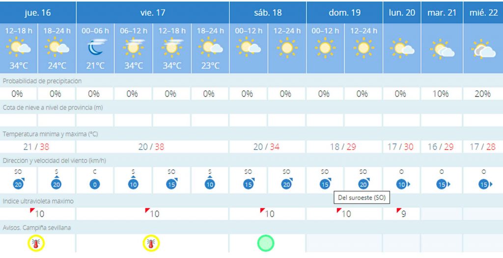 Para este viernes 17, la Agencia Estatal de Meteorología (AEMET) pronostica que las temperaturas serán prácticamente iguales a las de hoy jueves, con temperaturas máximas de hasta 38 grados centígrados y mínimas de 20 grados. El viernes será el último día de alerta amarilla por las altas temperaturas. Los cielos estarán mayoritariamente despejados y las probabilidades de precipitaciones serán inexistentes durante todo el fin de semana.