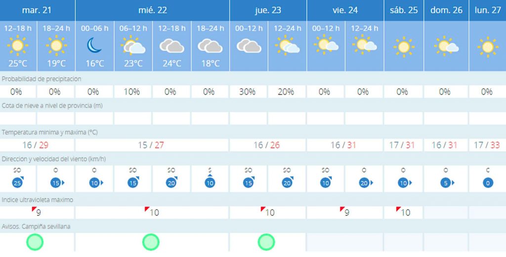 Será con el comienzo de la semana cuando las temperaturas volverán a subir de nuevo con respecto al fin de semana. El lunes 27 las máximas alcanzarán los 33 grados centígrados y las mínimas los 17 grados centígrados.
