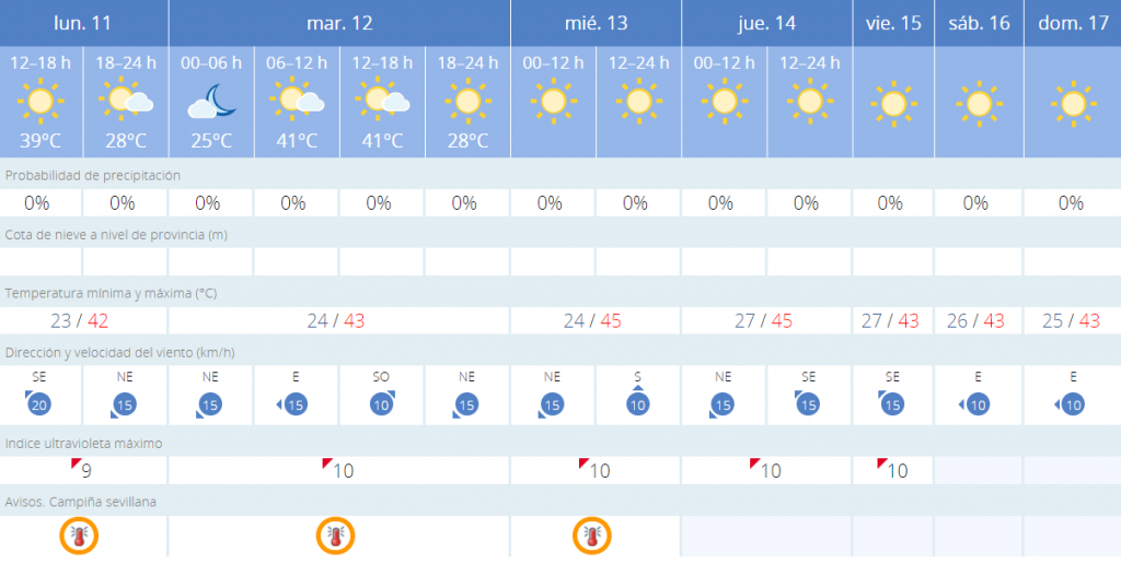 Lo peor de esta ola de calor se vivirá desde el ecuador de la semana hasta el fin de semana. Para el miércoles se mantendrán activada la alerta naranja por altas temperaturas en Sevilla, ya que los modelos de la Aemet pronostican una temperatura máxima de 45 grados. En cuanto a las mínimas, seguirán en 24 grados.