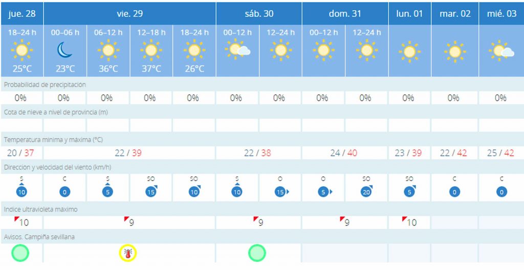 Los 40 grados centígrados volverán a Sevilla durante este fin de semana. El breve respiro que ha dado la ola de calor se disipará este viernes 29, cuando se alcanzarán máximas de hasta 39 grados centígrados y mínimas de 22. Además, este día será de alerta amarilla.
