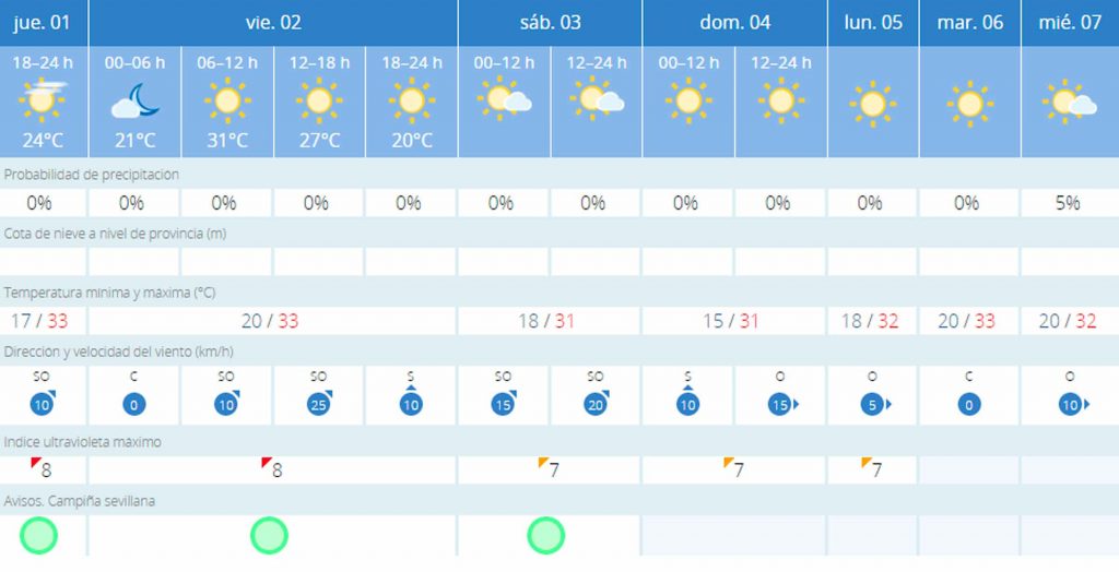 Las temperaturas seguirán descendiendo este fin de semana en Sevilla. Según la Agencia Estatal de Meteorología (AEMET), en el primer viernes de septiembre se espera que se alcancen los 33 grados centígrados de máxima, temperaturas similares a las de este jueves. Las mínimas se espera que sean de 20 grados.