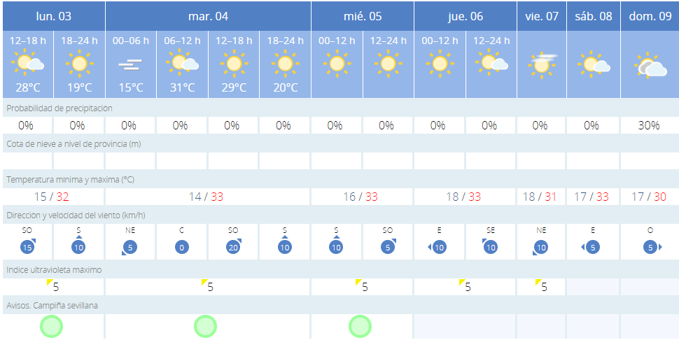 Según la Agencia Estatal de Meteorología (AEMET), este lunes habrá unos cielos despejados sin ninguna probabilidad de precipitaciones, que se mantendrán estables durante toda la semana hasta este domingo. Las máximas serán de 32 grados y las mínimas de 15.