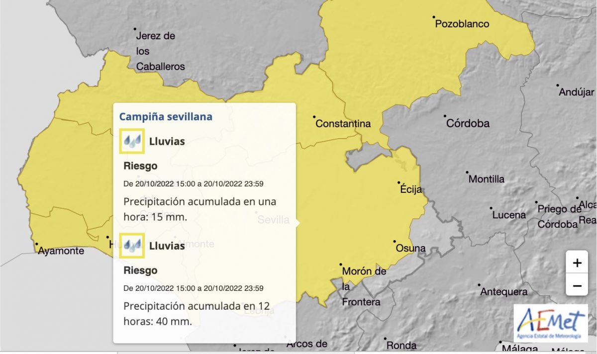 La Agencia Estatal de Meteorología (AEMET) activa la alerta amarilla por lluvias en las provincias de Sevilla, Huelva y Córdoba. El aviso de la AEMET se establecerá desde las 15:00 horas de este jueves 20 de octubre hasta las 9:00 horas del viernes 21 de octubre.