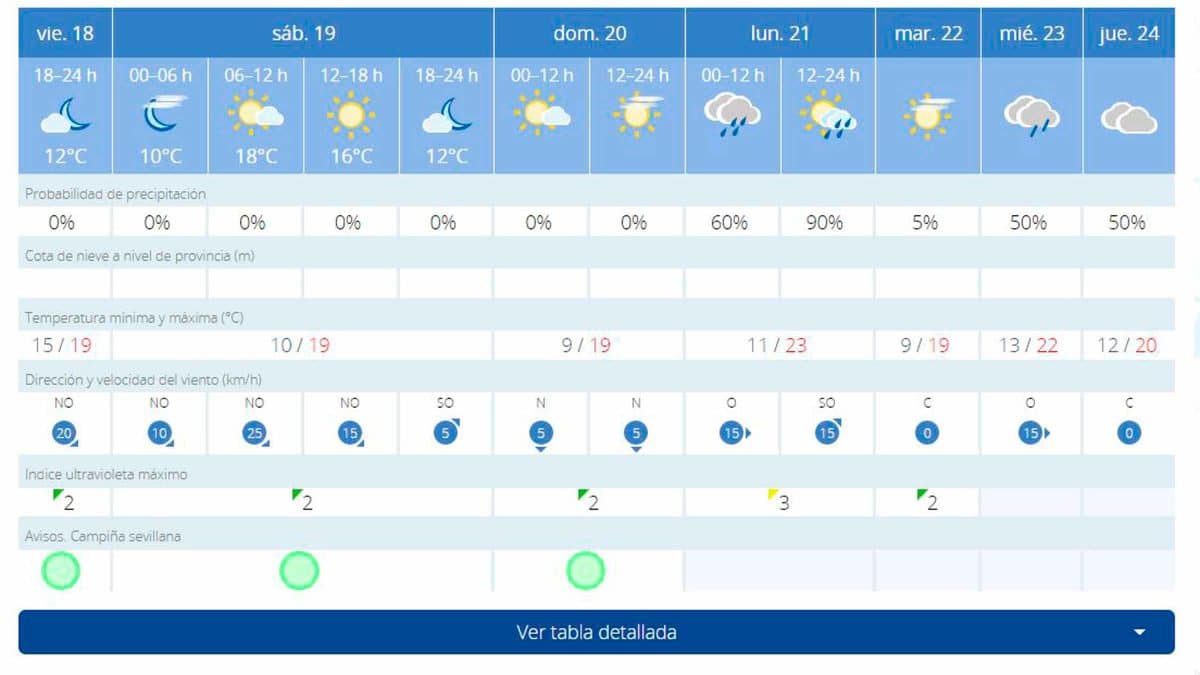 De las temperaturas mínimas del viernes, de 15 grados, se pasará a los diez grados, con unas máximas de 19 grados. Además, el domingo las mínimas bajarán aún más, hasta los nueve grados, mientras las máximas se quedarán igual. El lunes se augura una ligera subida de la temperaturas para volver pero el martes habrá una nueva bajada y se volverá a las mismas que el domingo.