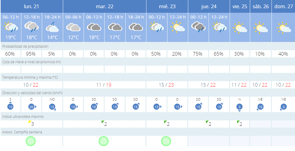 El miércoles 23 se producirá un aumento de las temperaturas, siendo las mínimas de 15 grados y las máximas de 23. Ese día habrá hasta un 50% de probabilidades de precipitaciones pero los cielos no estarán tan grises como en días previos.