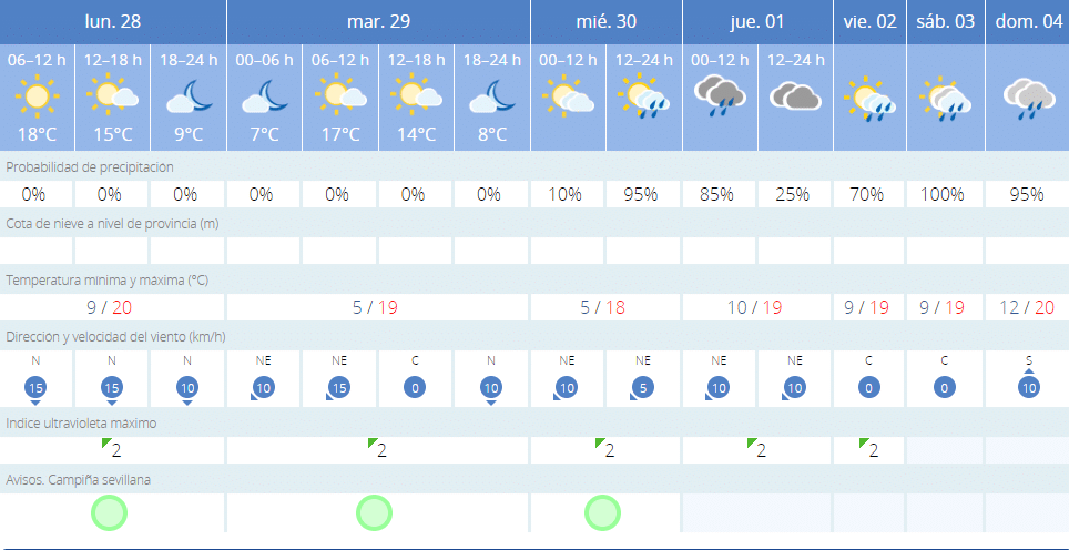 El fin de semana será lluvioso, alcanzándose el sábado un 100% de probabilidades de precipitaciones. Con respecto a las temperaturas en Sevilla, serán estables y oscilarán entre los 9 grados centígrados de mínima y los 20 de máxima.