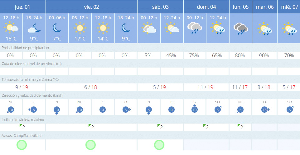La cosa cambiará el sábado 3, día del fin de semana en el que las lluvias volverán a Sevilla y se quedarán hasta la semana que viene. Las mínimas volverán a descender hasta los cinco grados centígrados, pero las máximas subirán un grado hasta los 19. Con respecto a la lluvia, a partir de las 12:00 horas las probabilidades de precipitaciones serán del 45%.