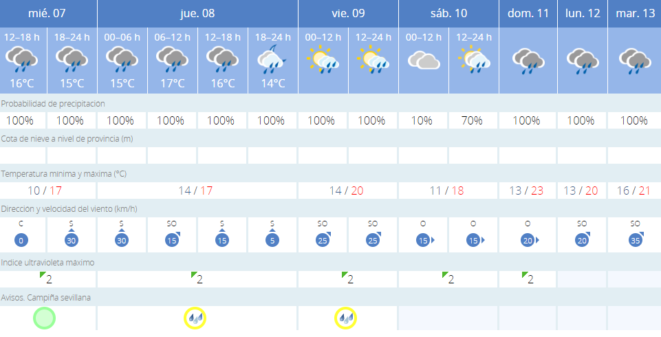 La lluvia no dará tregua con el tiempo este fin de semana en Sevilla, con aviso de alerta amarilla para el jueves y viernes (8 y 9 de diciembre) por las fuertes precipitaciones.