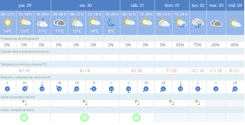 El domingo día 1, día de año nuevo, será cuando las lluvias hagan acto de presencia en Sevilla. Hasta las 12:00 horas, las probabilidades de precipitaciones serán del 5%, pero aumentarán hasta un 65% pasado el medio día. Con respecto a las temperaturas, las mínimas serán de siete grados centígrados y las máximas de 20 grados.