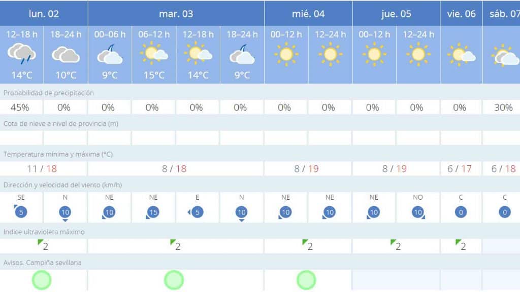 El frío, por su parte, no da tregua, y la AEMET pronostica una bajada gradual durante esta semana. Para este lunes, las mínimas serán de once grados y las máximas de 18, con una probabilidad de precipitación del 45%. El resto de la semana no se espera que llueva, pero sí que sigan bajando las temperaturas. Así, este martes, las mínimas serán de ocho grados centígrados, y las máximas también de 18. Sin embargo, el miércoles y el jueves, Sevilla tendrá sus cielos completamente despejados, y su temperatura máxima alcanzará los 19 grados.