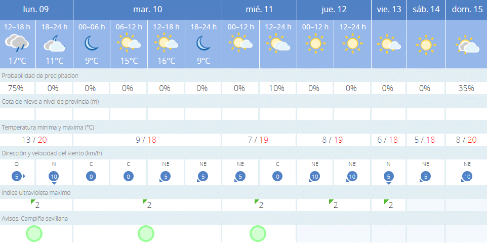 El próximo sábado 14, se producirá la bajada más pronunciada en las temperaturas mínimas de la semana en Sevilla, día en el que los termómetros marcarán solo cinco grados de mínima. Las máximas serán de 18 grados.