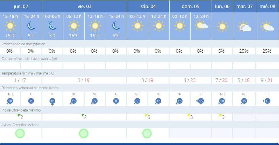 En cuanto a las mínimas, subirán junto a las máximas, siendo de tres grados hasta el sábado y seguirán subiendo hasta alcanzar su máxima el miércoles, donde habrá nueve grados de temperatura mínima en Sevilla.