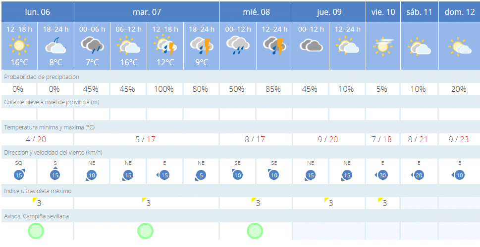 Según la Agencia Estatal de Meteorología (AEMET), para lo que queda de lunes, no se esperan precipitaciones. Será el martes día 7 cuando la lluvia se deje caer por Sevilla incluso acompañada por tormentas. Hasta las 12:00 horas del mediodía, las probabilidades de precipitaciones serán del 45%. El resto del día alcanzarán el 100%. Con respecto a las temperaturas, se esperan mínimas de cinco grados centígrados y máximas de 17.