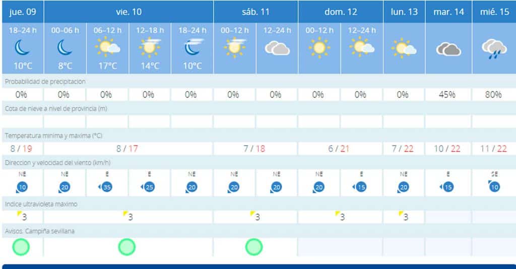 Después de unos días de lluvia y frío suben las temperaturas en Sevilla a partir del Viernes. Desaparecen las precipitaciones aunque las mínimas seguirán estando a la baja pero sin probabilidad de precipitaciones.