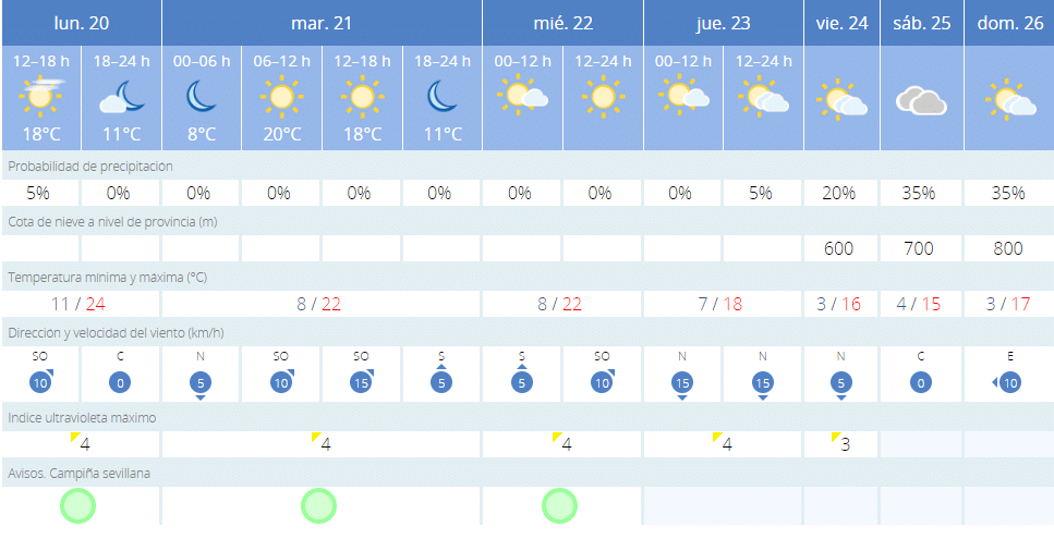 Para este martes día 21 de febrero, la Agencia Estatal de Meteorología (AEMET) pronostica que las temperaturas mínimas serán de ocho grados centígrados y las máximas serán de 22. Los cielos estarán despejados y no se esperan probabilidades de precipitaciones. El miércoles 22 será exactamente igual que el martes, sin cambio alguno en las temperaturas.
