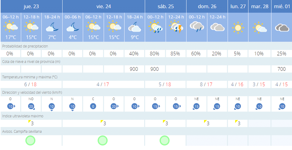 El sábado 25 amanecerá con lluvias, ya que las probabilidades serán del 80%. A partir de las 12:00 horas, las posibilidades de lluvias en Sevilla aumentarán un 5% más y se esperan que se produzcan tormentas. Con respecto a las temperaturas, aumentarán con respecto al viernes, siendo ahora de cinco grados centígrados de mínima y 18 de máxima.