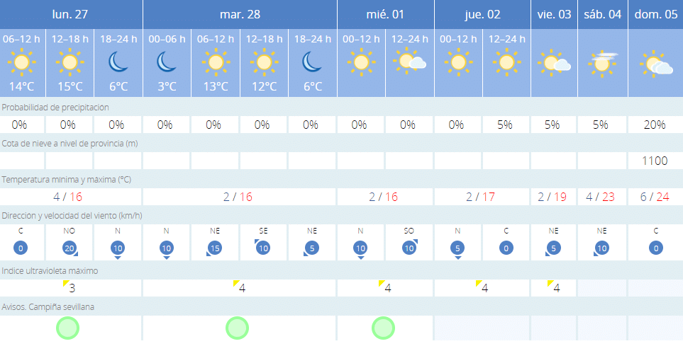 El sábado día 4 finalizará el descenso de las temperaturas en Sevilla y tanto las mínimas como las máximas comenzarán a ascender, alcanzándose ese día los cuatro grados de mínima y los 23 de máxima. El domingo 5 será el día más caluroso de la semana, con seis grados de mínima y hasta 24 de máxima. Las probabilidades de precipitaciones será del 20%.