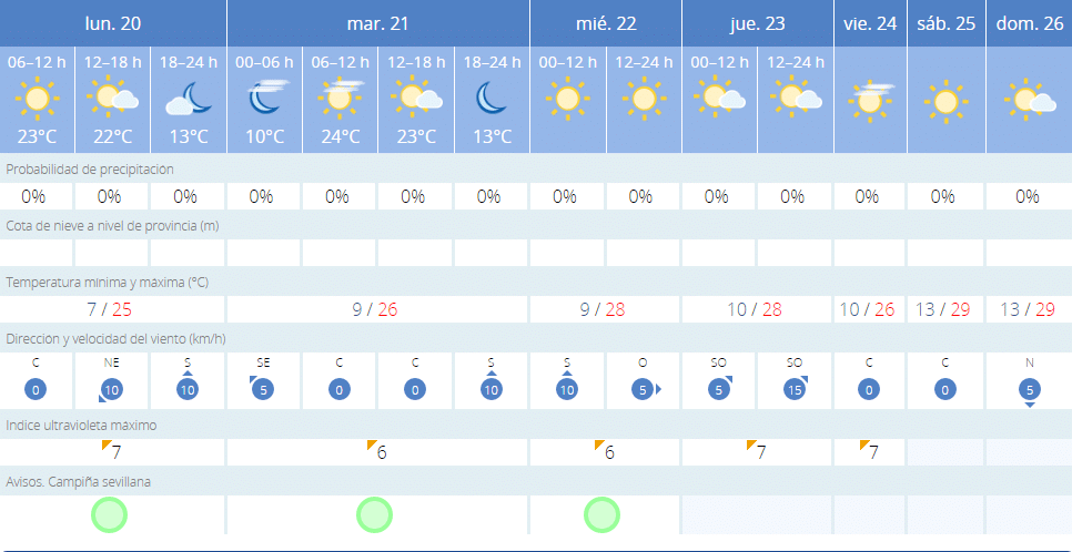Este lunes, a las 21:24 horas, entrará la primavera en Sevilla, y lo hará dejando unas temperaturas que esta semana llegarán a alcanzar los 29 grados centígrados de máxima. La lluvia, que hizo un breve acto de presencia la semana pasada, no se dejará ver en ningún momento de la semana.