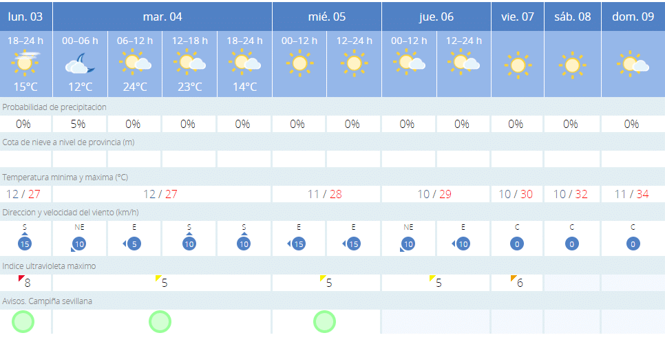 Según la AEMET (Agencia Estatal de Meteorología) se espera una probabilidad de lluvia del 0% todos los días excepto en la madrugada del Martes Santo que cuenta con un 5% de probabilidades de precipitaciones. Las temperaturas continuarán altas con mínimas de 10º y máximas de 29º hasta el Jueves Santo. A partir del Viernes Santo habrá un ascenso de las temperaturas que durará hasta el Domingo de Resurrección, con máximas de hasta 34º. En conclusión, nada de lluvia y mucho calor para la segunda mitad de la Semana Santa.