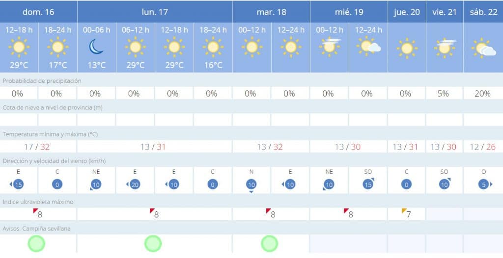 Durante la semana previa a la Feria de Abril se vivirán en Sevilla temperaturas propias del verano más suave, a pesar de estar en primavera. El lunes 17 de abril se esperan mínimas de 13 y máximas de 31 grados, con cielos totalmente despejados y ninguna probabilidad de lluvia. Lo mismo del martes al viernes, variando tan solo las máximas en torno a uno o dos grados, siendo el miércoles el día más caluroso, con 32 de máxima.