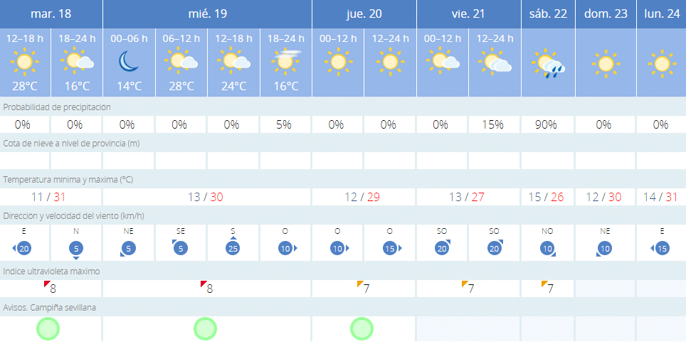 Esta por ver como continuará el tiempo en la Feria de Sevilla, dado que la Aemet aún no ha sacado predicciones de los días restantes. Pero lo que sí se espera es que la lluvia desaparezca y aumente las temperaturas, llegando a un calor característico del verano.